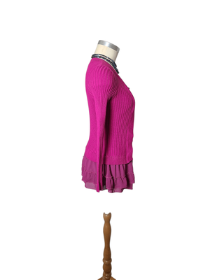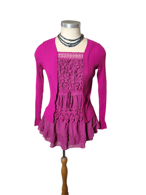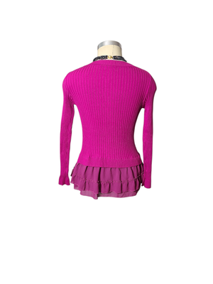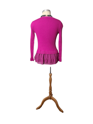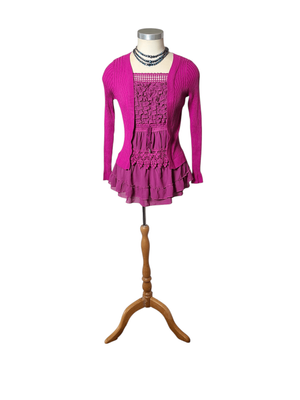 Photographing brighter than it is, this triumph in knitwear is nothing if not different. Busy with frill, sequin and fussy cuffs. Not for everyone, but for those that can appreciate the unique presence it is stunning.