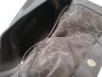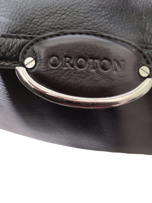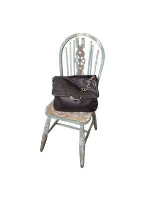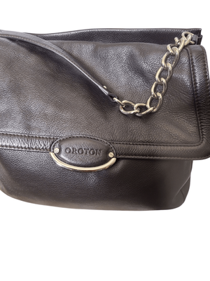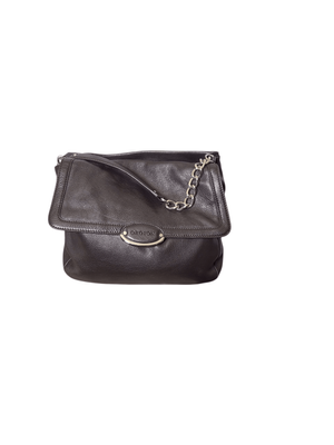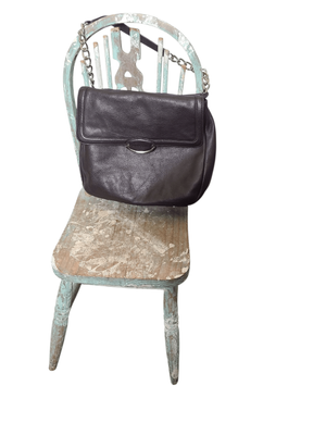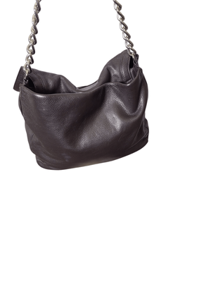 Great capacity, separate compartments, dark donkey brown. Shorter chain strap. Silver domes on base of bag.
