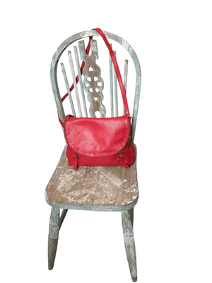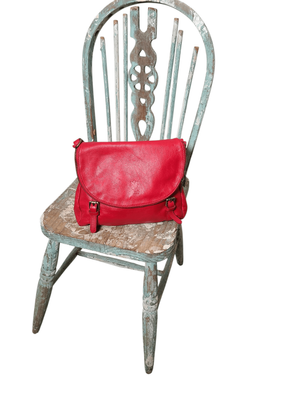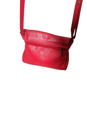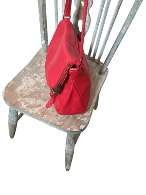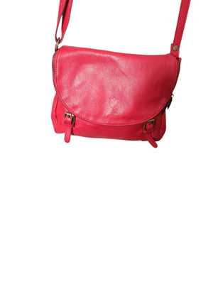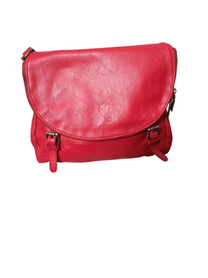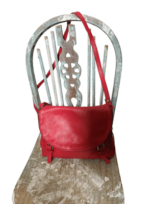 Gorgeous cherry red colour. Long shoulder strap, zip compartment front and back. Cream/ beige interior.