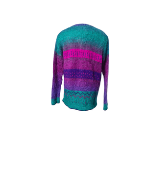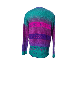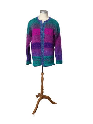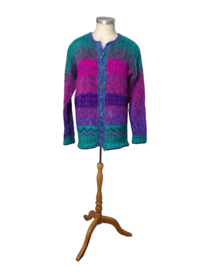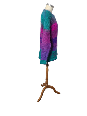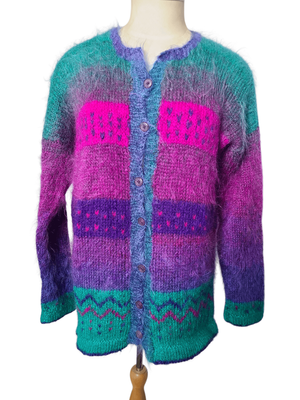 100% Mohair and 200% gorgeous. Superb with denim skirt or jeans, all you need is a polo or light skivvy underneath and you are away. The pattern, the wool, the knitter!