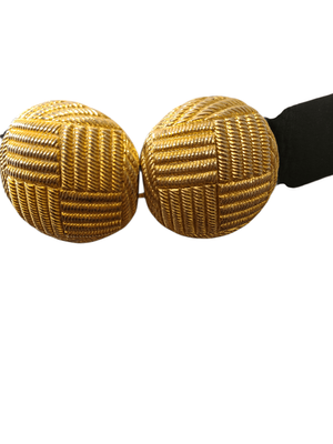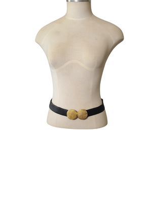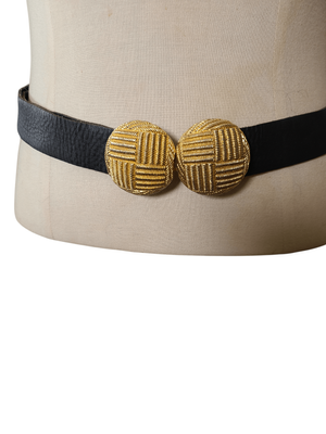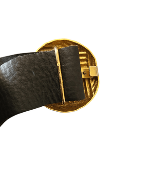 A dark donkey brown leather belt with stunning golden clasp fastener.