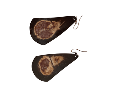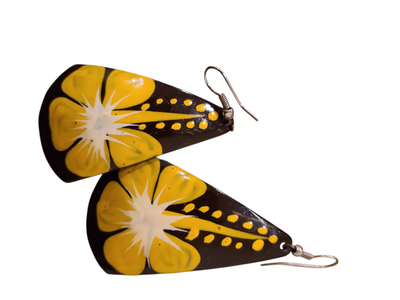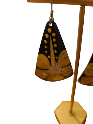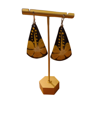 Dangle drop earrings, brown back ground and frangipani.
