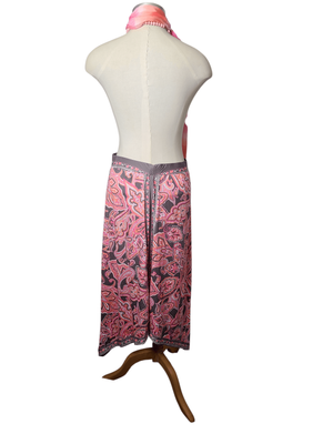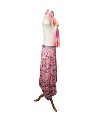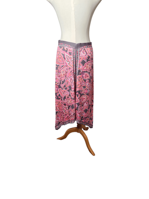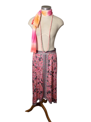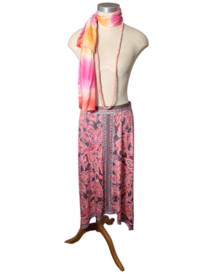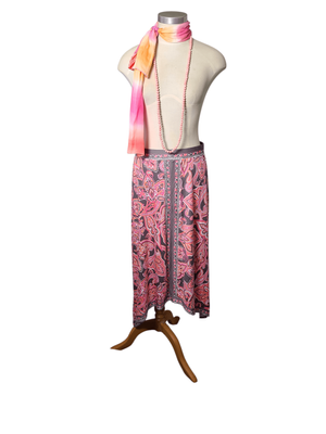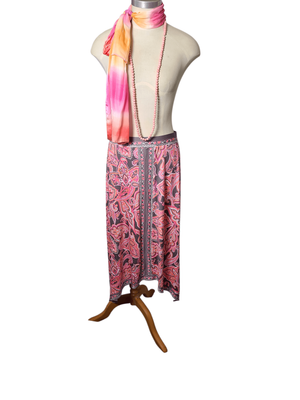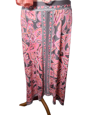 Gorgeous pink paisley maxi skirt with handkerchief hem and taupe accents.