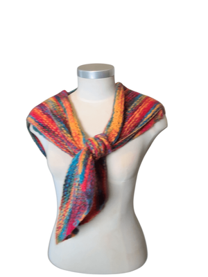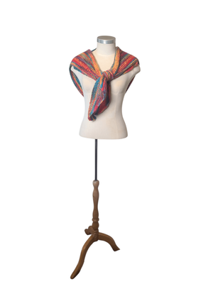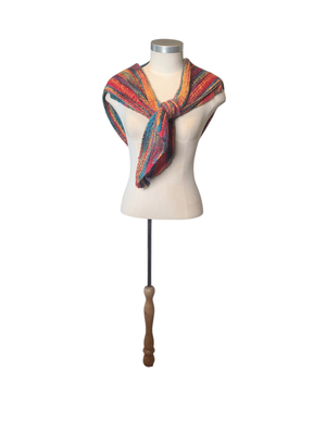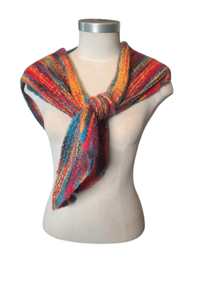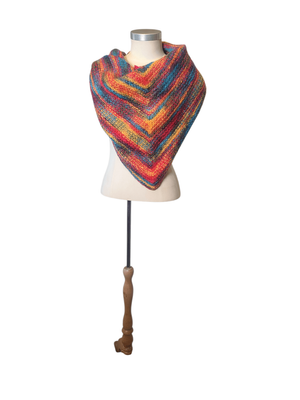 Bursting with vibrant, joyful colours, this shawl is perfect for adding a bold vintage touch to any outfit. The classic triangular shape allows it to be worn in multiple ways—draped over the shoulders, wrapped snugly around the neck, or styled as a statement layer.