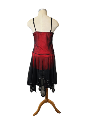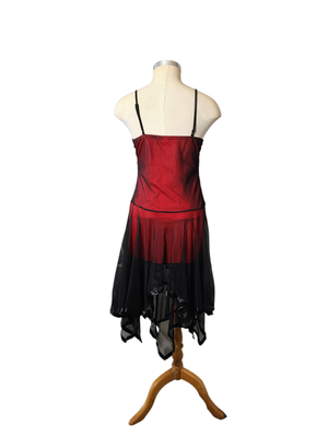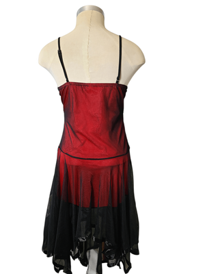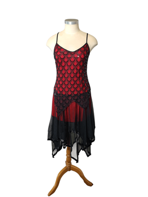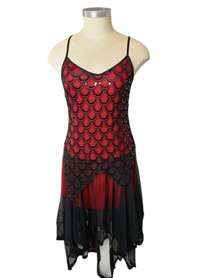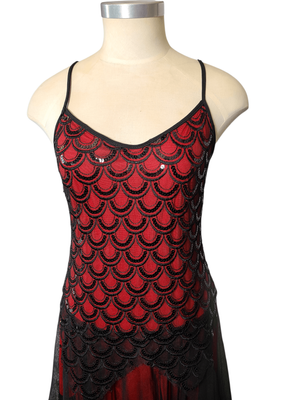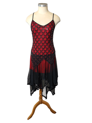 Step into timeless vintage glamour with this striking flapper-inspired red and black dress. Elegant and eye-catching, this piece features delicate spaghetti straps, a beautifully flowing handkerchief hem, and a lovely scalloped design that adds texture and movement.