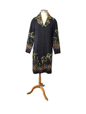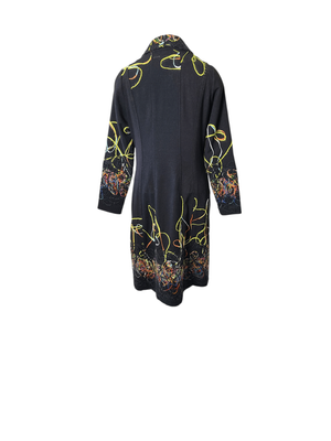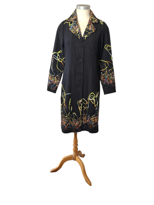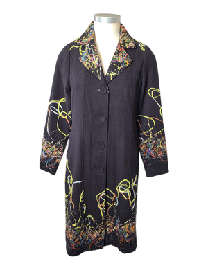 The standout feature is the artistic ribbon appliqué detailing, with vibrant, swirling threads dancing across the collar, sleeves, and hemline. The richly textured appliqué ribbon collar frames the neckline beautifully, making this coat a true wearable artwork.