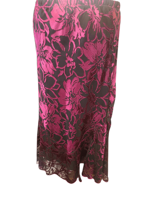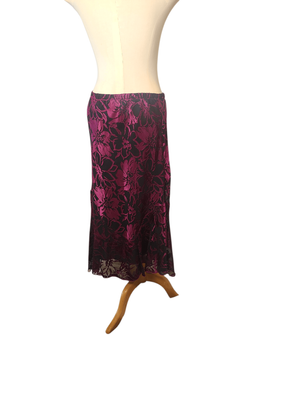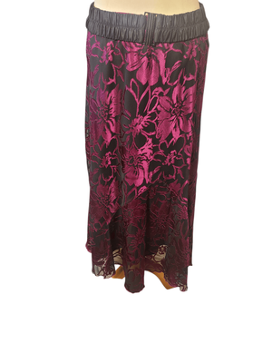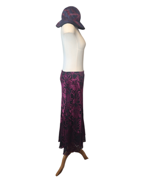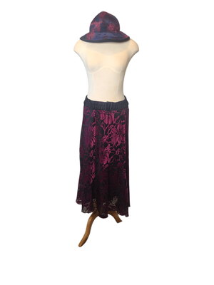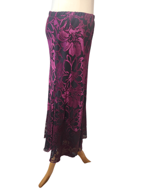 Add a touch of vintage glamour to your wardrobe with this stunning Purple Sage velveteen maxi skirt. Rich burgundy and deep plum tones create a dramatic floral pattern that catches the light beautifully, giving the fabric a luxurious sheen.