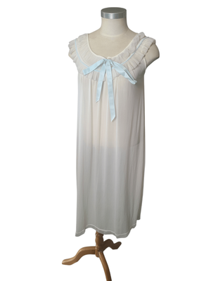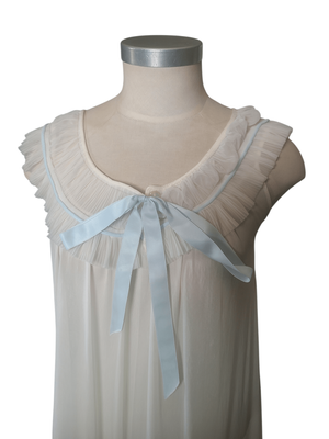 Soft cream nightie with ruched neckline + blue ribbon.