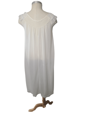 The nightie is a soft cream beauty with delicate ruched detailing around the neckline and décolletage, finished with a charming pale blue ribbon accent. Light, feminine and effortlessly romantic, it falls below the knee for that classic vintage boudoir silhouette.