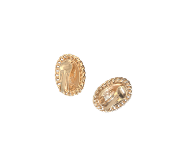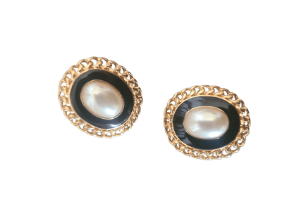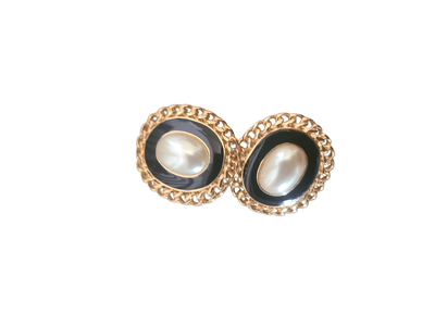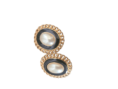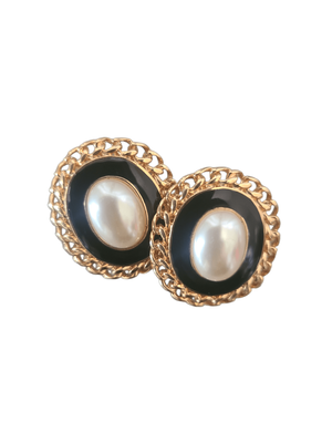 These vintage clip-ons feature a luminous faux pearl centre, framed in glossy black enamel and finished with a rich gold-tone chain setting.