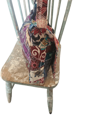 Rich jewel tones meet earthy neutrals in a tapestry of prints, with visible stitching that adds to its perfectly imperfect, bohemian charm. Soft, slouchy and easy to wear, it’s designed for everyday wandering — markets, road trips, or your favourite coffee stop
