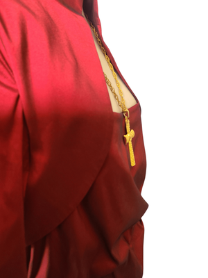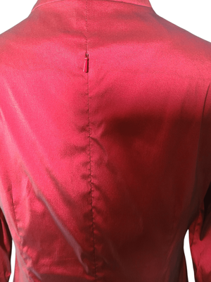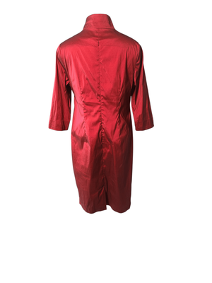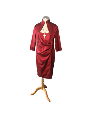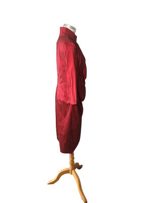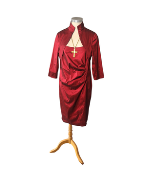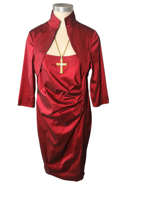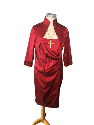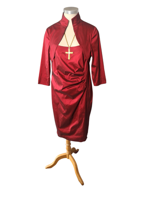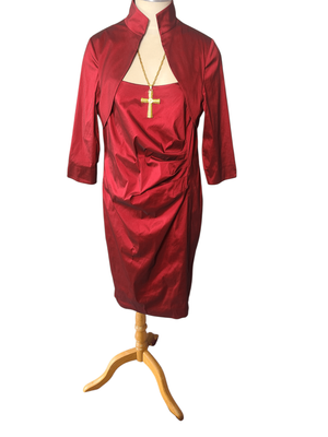 A striking deep ruby red dress featuring a cleverly designed built-in bolero-style overlay, giving the illusion of a two-piece while remaining a single, beautifully structured garment.