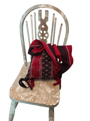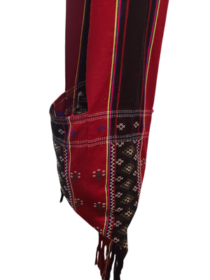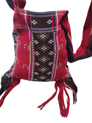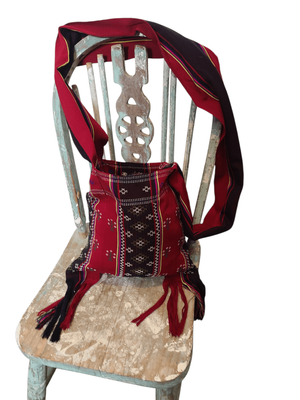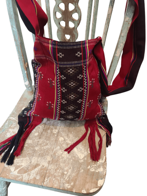 A beautifully woven piece featuring deep crimson, black, and earthy tones with delicate geometric patterning throughout. Finished with long tassel detailing and a soft, wide strap — this one feels both practical and statement. It has that traditional textile feel. The kind of bag that carries culture, craft, and story in every thread. Perfect for adding depth to simple outfits, layering with knits, or elevating a neutral look.